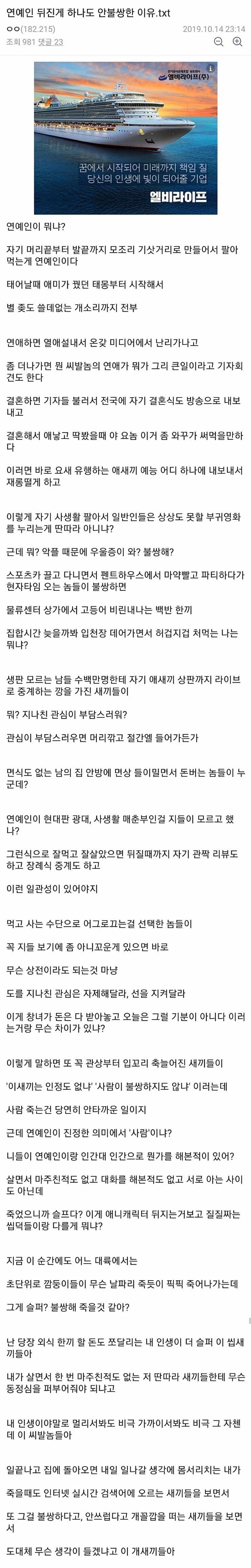 하지만 연예인도 사람입니다 사람. 사람 팔아서 장사하는 건 맞지만 그래도 기분이 나쁜 건 어쩔 수 없지. 좆같지만 지금까지 쌓아온 특권을 다 포기할 순 없으니 연예인 관두지는 못한다. 본인이 선택한 건데 악으로 깡으로 버텨야지.